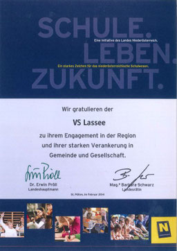 Aus der Initiative „Schule. Leben. Zukunft“ wurde unsere Volksschule für den großen Beitrag für das Zusammenleben und für die Verankerung der Kinder in der Gemeinde und in der Region durch das Land NÖ prämiert. Diese Auszeichnung soll zeigen, welch hohen Stellenwert die Volksschule für die Gemeinde und das regionale Umfeld hat.